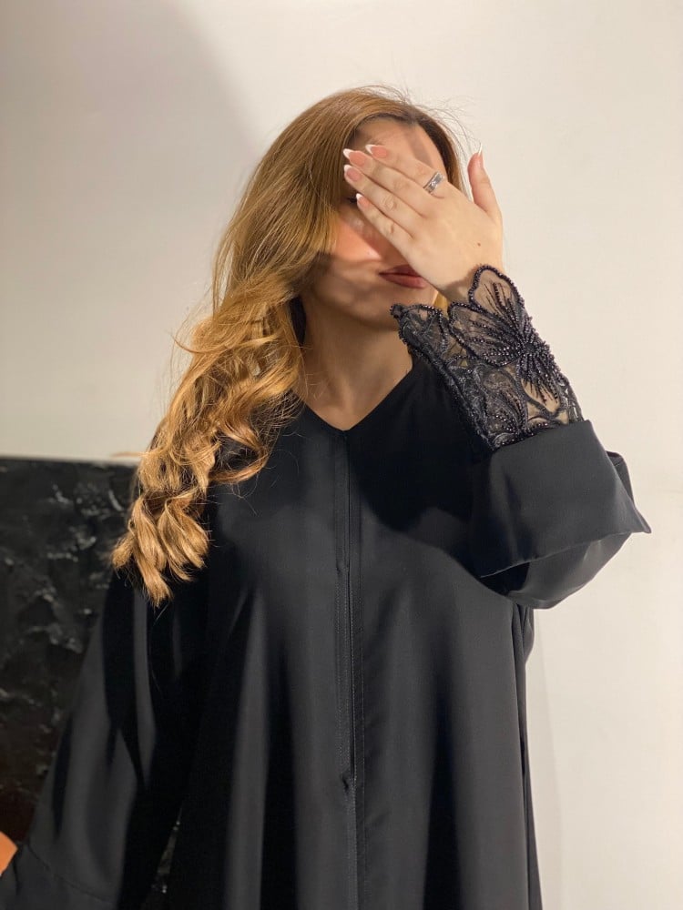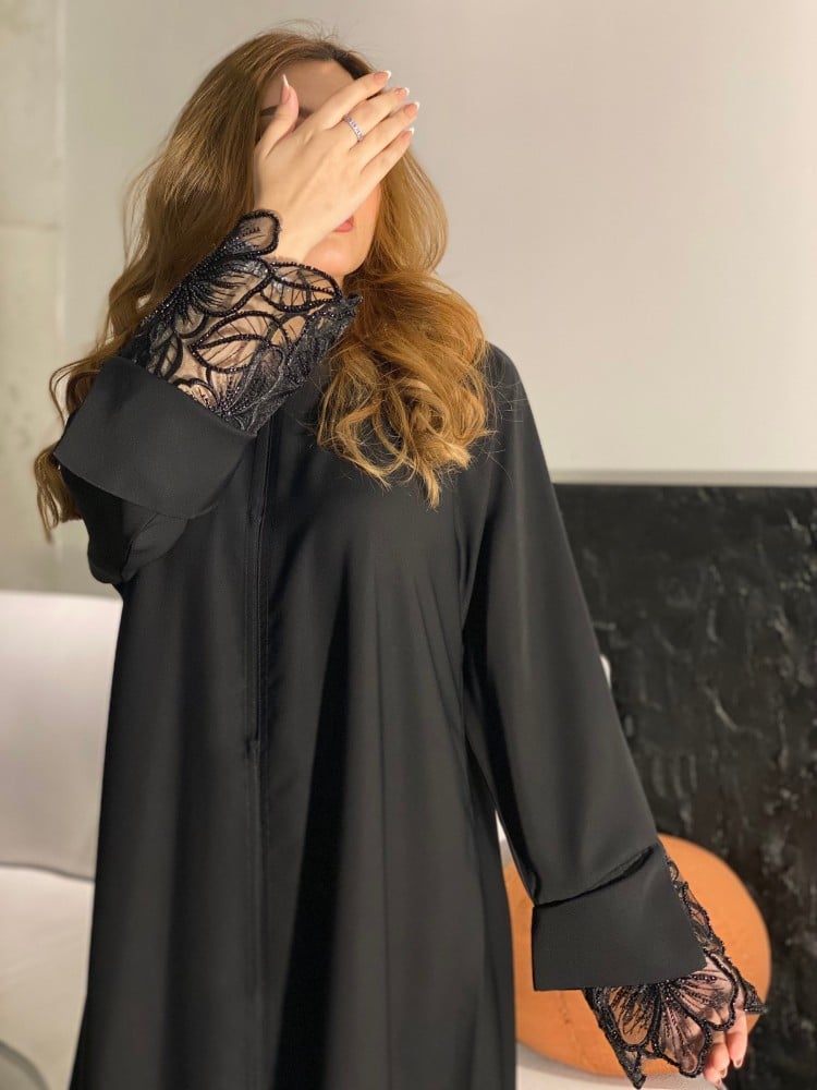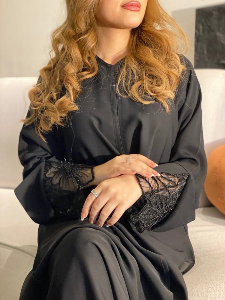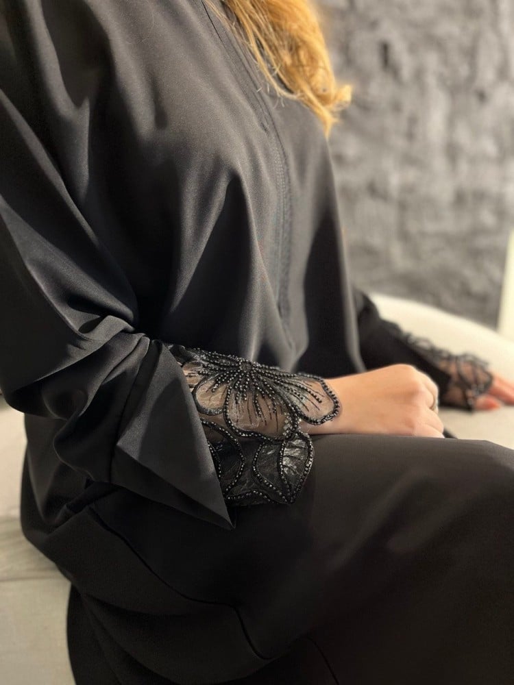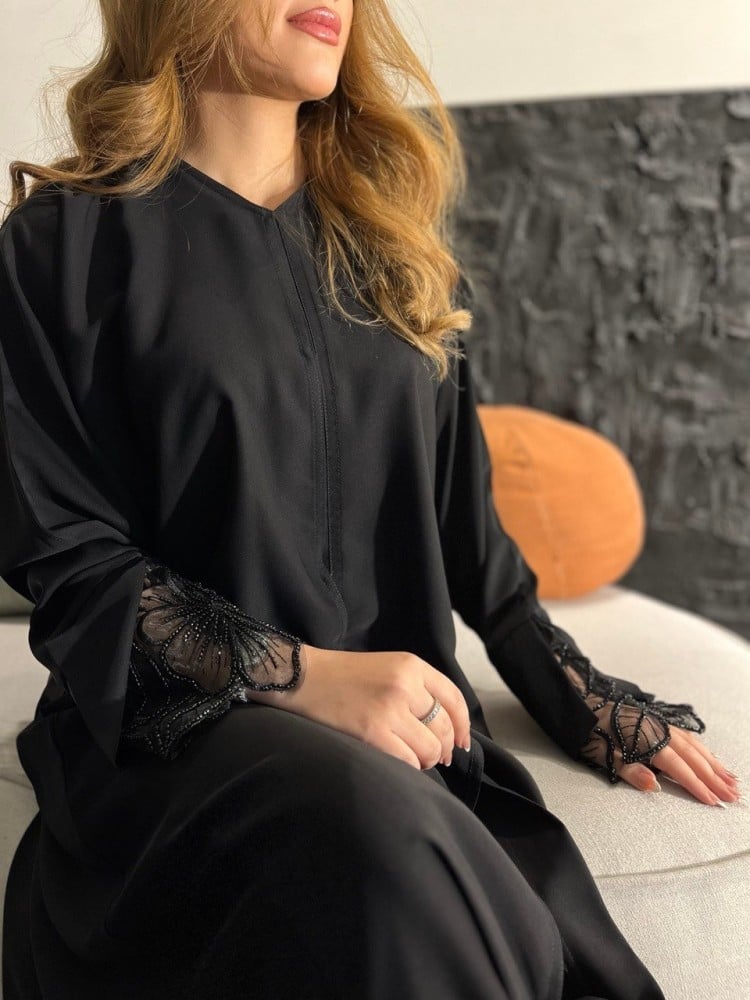 عباية كلوش بأكمام دانتيل بشكل مميز وشك اسود